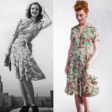 When most think of the 40s they think of the tea dress. The dress for dances - floral, gored, sweetheart neckline, puffed cap sleeves. There probably isnt a more iconic look associated with a decade - but there are many dresses in this era that fit the category. Shirt dresses were very popular and versatile but more utility in style or a 30s dress reworked into a more modern style dress by pulling the neckline back into a sweetheart style.