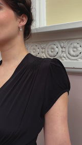 Dress has a high back neckline which hugs the back of the neck but alllows the deep plunging cross over neckline to remain demure and not too revealing. Bodice of dress is based on an original vintage 1930s nightwear garment and as a result has authentic detailed gathers into the shoulder and top stitched. The cute cap sleeves hug the shoulder and create an elegant silhouette. Gathers under bust creates a flattering line into a slimming fit around the waist through the fitted waistband. With a sweeping 7-gore skirt to float you through any tea dance.