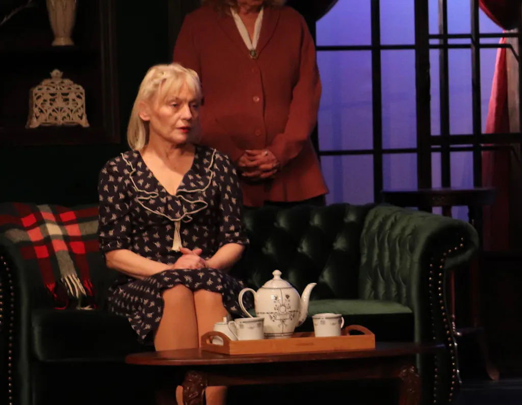 Dress has flattering V neckline with pleat details at the centre bust-line which are reflected in the sleeve detail. The flounce/frill edged in contrast thread flows the neckline and finishes with a contrast drop bow at the centre front.