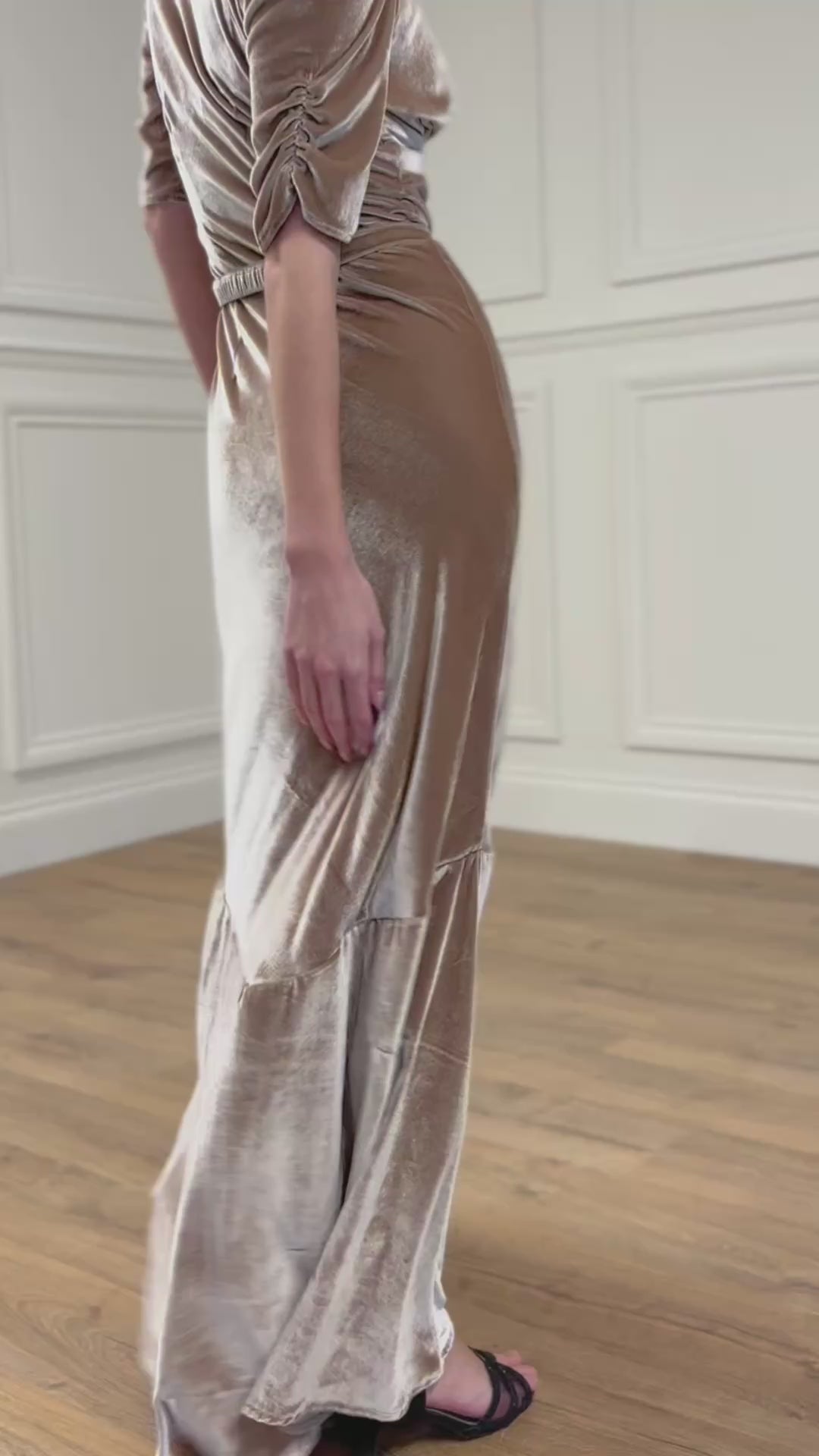Crafted in a liquid-soft antique champagne velvet, the gown catches the light with a molten shimmer, shifting effortlessly between soft bridal gold, rose-warm champagne, and luxe evening bronze. This is a colour that transcends seasons and occasions - bridal, bridesmaid, seasonal parties - always impeccable, always breath-taking.