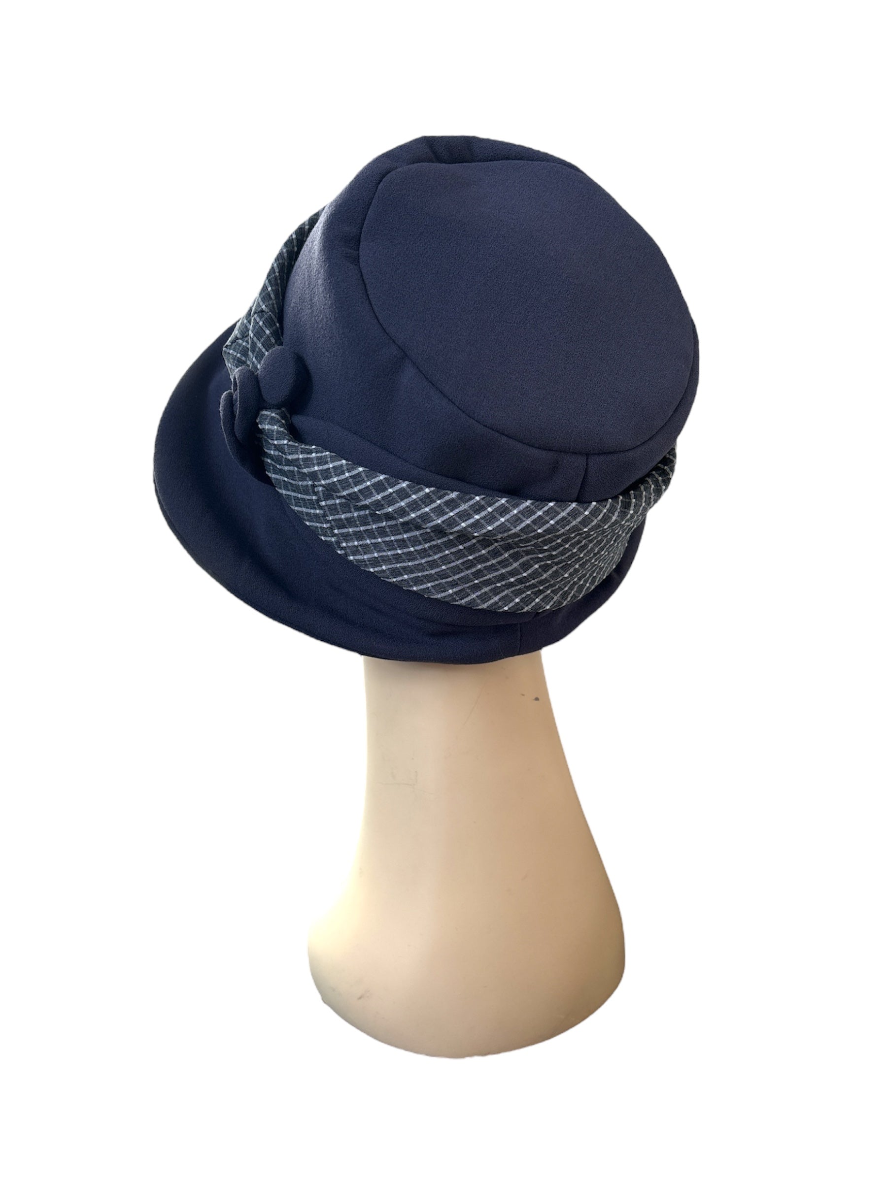 Based on the hat styles of the early 1930s, this is a fabulous design that shows the movement away from the cloche style so favoured in the 1920s. Circa 1932, this hat still fits snuggly on the head and extends to the jawline but has a wired brim that frames the face more.