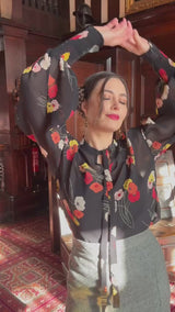 Celebrate a winter Valentine's Day with our exquisite limited edition blouse, crafted from enchanting black georgette fabric adorned with our iconic 1930s poppy foxy print. This stunning piece captures the essence of romance, showcasing intricate details that make it a true statement blouse. It pairs beautifully with our limited edition wool flutter skirt, creating the ultimate romantic 30s-inspired ensemble - designed for those who adore sophisticated style.