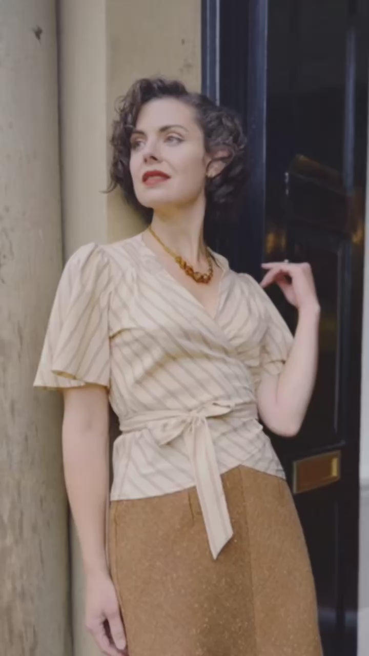 Our stunning 'The Long Afternoon' Autumn/Winter Capsule proudly reintroduces our Wrap blouse, our foxy-favourite 30s blouse, now available in our seasonal 'Oakline Stripe' print - creamy tones intersected by twin stripes, like twin trunks in a woodland grove...