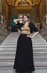We have adapted our bestselling Ava dress into an evening gown set that will make you swoon! Bodice is made in gold satin rayon and set to a floor length skirt in our signature heavy crepe. Iconic '40s bolero is in matching heavy crepe. This is so close to early 1940s styles where 1930s dresses were adapted during wartime austerity.