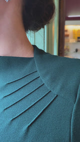 Dress has a demure high neckline with fitted shoulder yokes above 5 pintucks sunburst arrangement. Simple bodice then has two tucks into the waistline with a simple pannelled swing skirt. Sleeves are extra special - three darts in the head with a tuck into the hem.