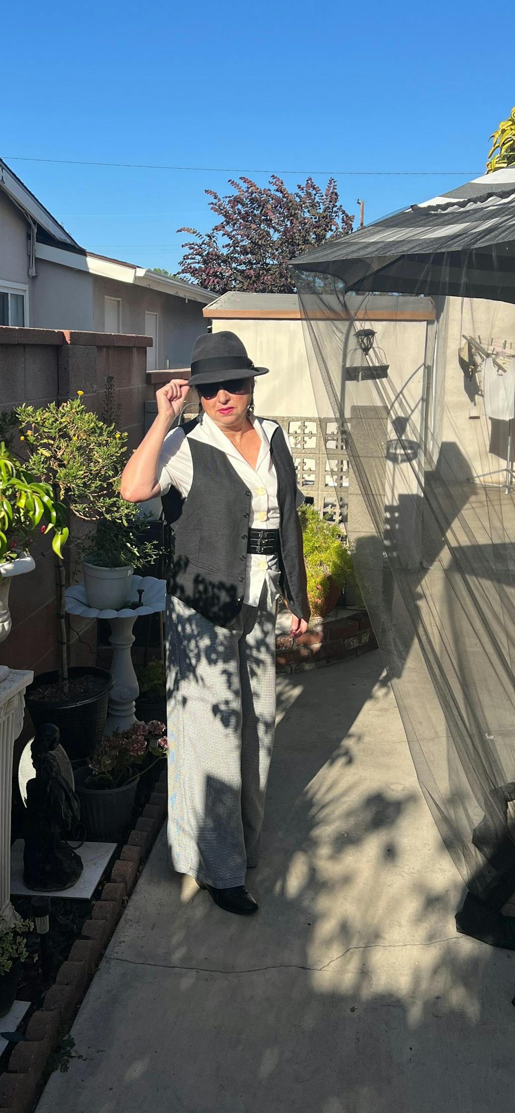 This blouse is packed with vintage details including a wing collar, dolman sleeves with cute turn ups on the sleeve and fitted with darts into the waist. Wear with a bullet bra for a full on effect!