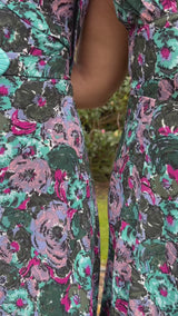 Print is a reproduction of a 1930s original - white based with stylised floral details in pink, purple, forest green, blue and teal. This dress will take you right through all seasons when paired with correct accessories. Wear with tights and boots and a woolly cardi in cooler days or free and flowing with sandals when warmer. This dress will work all seasons!