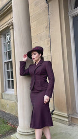High waisted, slim fitting skirt is cut on the bias for fit with a front centre inverted pleat. Close fitting on the waist and hip, skirt flares slightly from the knee area onwards to the hem. This creates the slight fish tail effect so typical in mid 1930s fashions. Inverted pleat mirrors the pleats on the matching jacket.