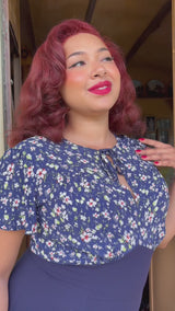A spring colourway for our best selling tea dance dress - named after wartime pinup 'Betty Grable'. This colourway is a navy crepe on the skirt paired with our seasonal 'nightblossom' print on the upper bodice.