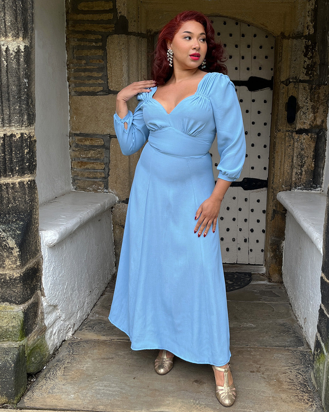 Design is 1940s inspired with some creative licence thrown in. The neckline and sleeves have the most detail being gathered and top stitched in several areas to create a lovely demure sweetheart neckline. This is a very authentic 1940s neckline that flatters the bust and creates a stunning silhouette.