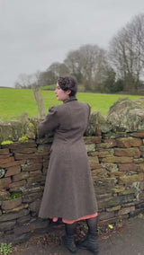 Princess line panels are double stitched to highlight the style and skim the body, gently nipping in at the waist. Shoulder are strong with pads and are slightly gathered to enhance the shape and create that iconic late 1930s/40s silhouette. Two pockets at hip and one on wearer left chest have flap that can be tucked in. Coat is further enhanced by 6 covered buttons and, as per our inspiration pictured, can be done up to the neck for a real vintage look.