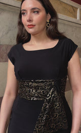 This is such an exquisite dress, the gold brocade cummerbund feature nips in at the waist and creates a real unique feature. Due to the curve of the cummerbund under the bust and the tucks - the dress creates a flattering shelf bust shape so iconic of the time. The fabric is figure forming and holds you in whilst fitting to your curves.