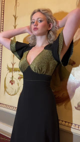 Limited Edition. A fabulous new 1970s dress inspired by an original...that had been inspired by the 1930s! This super elegant black and gold midi dress is simply timeless.